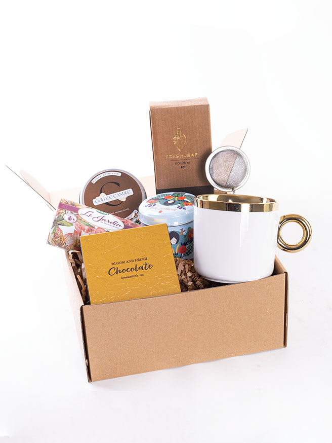 Birbirinden özel ve içerisinde çikolatadan kahve çekirdeğine, french press'ten mug'a kadar çeşitli ürünler olan butik hediye kutuları Bloom & Fresh'te.